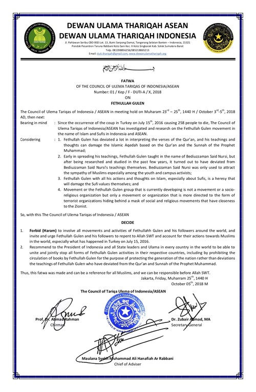 Sebagai catatan, DUTI-Asean yang dipimpin oleh Syekh Muhammad Ali Hanafiah Ar Rabbani merupakan satu-satunya organisasi ulama yang secara tegas mengeluarkan fatwa terhadap penyimpangan ajaran yang disebarkan oleh FETO. Fethullah Gulen dikenal sebagai seorang politikus yang berusaha membangun citra dirinya di tengah masyarakat Turki sebagai ulama dengan pemahaman tasawuf.